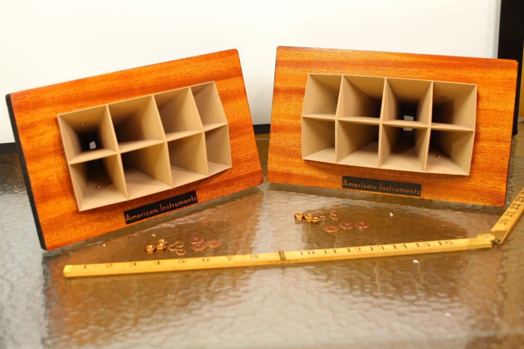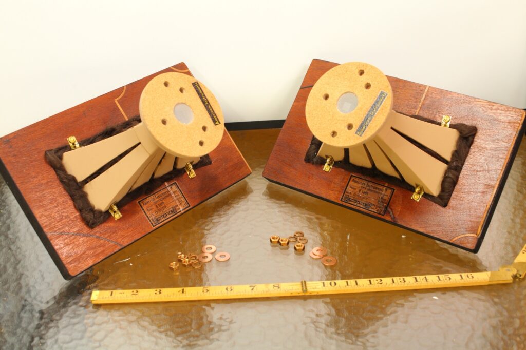 American Instruments audio accessories and devices are made with old world sound quality and feel in mind. Modern hardware would not do. Each horn is hand-assembled with the finest possible Imperial threaded, brass, and copper hardware. The slim nickel plated brackets (treated with gold tint varnish) are NOS from the 1940s.