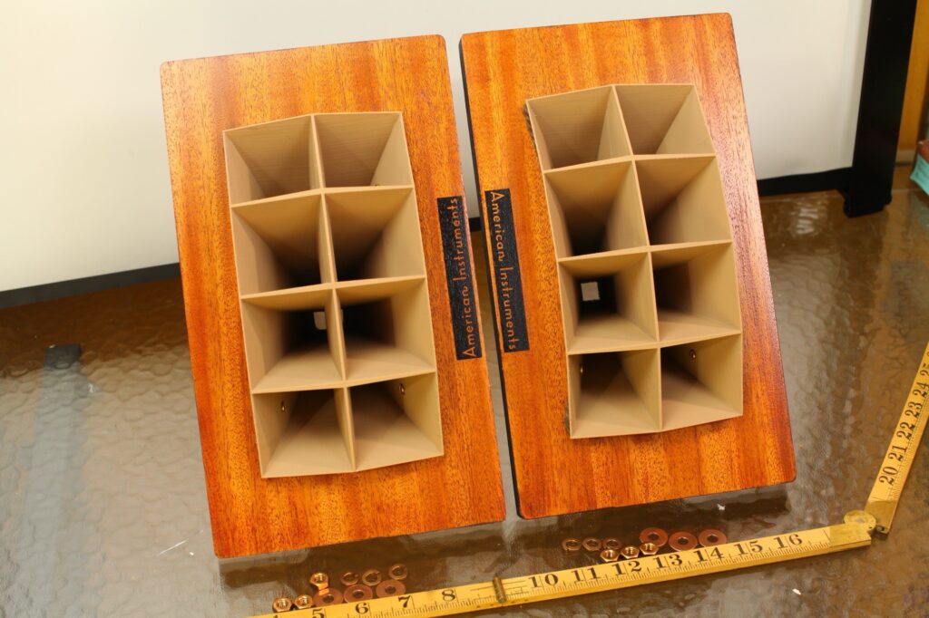 Vintage plywood forms the front frame or “baffle” of the H1000. This forms non-structural front surface, creating the same wavefront area, which can be positioned on the same plane as most any woofer. This 60-80 year old plywood has layers of old growth domestic wood varieties, along with no longer used water sensitive, super hard organic glues.